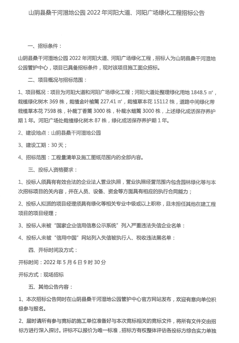 山阴县桑干河湿地公园2022年河阳大道、河阳广场绿化工程招标公告